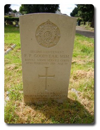 | Notes: | MMP. Later 2/Lieut. Army Service Corps, 15/12/1917. Awarded the 1915 Star, Victory and War Medals. First served abroad (1) France, 15/1/1915 to 4/11/15 and (2b) Gallipoli 5/11/15 to 14/6/16. Address: Mrs F P Goodyear (widow), 2 Brights Villas, Bemerton, Salisbury. Gravestone has Army Service Corps cap badge, inscription on gravestone: Also his son Leonard Pearce Goodyear, 14 July 1999, Age 90. |