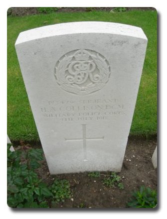 | Citation: | MFP. France & Flanders. DCM citation.P/3479 LANCE CORPORAL (ACTING SGT) H A COLLISON MILITARY FOOT POLICEFor conspicuous gallantry and devotion to duty. He has served at the front during many engagements. His duties, which mainly consisted in making inquiries into the alleged looting of the dead, took him frequently into positions of great personal danger. |