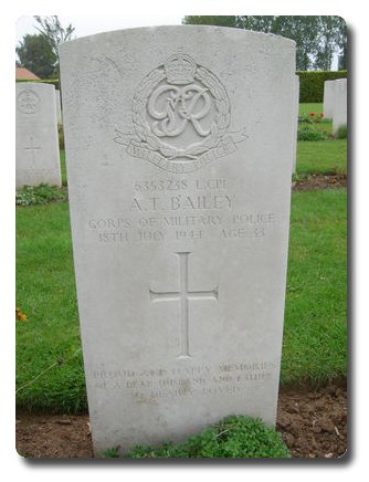 | Notes: | CMP. 7 Armd Div Pro Coy. Enlisted in the Royal West Kent Regiment, transferred to CMP. He was born and resided in London SE. Unit War Diary 7 Armd Div Pro Coy WO 171/454. 18/6/44 L/Cpl Bailey, 22 Armd Bde, killed in action by enemy shelling. Casualty List 1514/14, North West Europe, Killed in Action, 18/7/1944. 5/9/49 He was awarded the 1939-1945 Star, Africa Star, Italy Star, France & Germany Star, Defence Medal, War Medal. Address:- Anlev, Settle, Yorks Inscription on gravestone: Proud and happy memories of a dear husband and father, so dearly loved. Albert Thomas Bailey. |