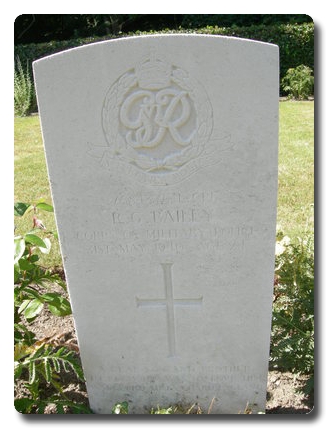 | Notes: | CMP. He was born in Somerset and resided in Exeter and enlisted in to CMP. 1 Div Pro Coy. Inscription on gravestone: A dear son and brother, to know him was to love him. Wadeford Mills, Chard, Somerset. Casualty List 234/7, BEF, France, Killed in Action, 31/5/1940 (L247 deleted) No. shown as 7686375. Casualty List 236/5, BEF, France, Killed in Action, 31/5/1940. , No. shown as 7654375 in this roll. Casualty List 247/26, BEF, France Killed in Action, the above entry should be deleted, 31/5/1940. Casualty List 655/5a, BEF, France, List 236, killed in action, army No. should read 7684375. 3/1/49 He was awarded the 1939 - 1945 Star, Africa Star with 1 army clasp, Italy Star, Defence Medal, War Medal, MID. Address:- 13 Roseland Road, Kenilworth, Warwickshire. Raymond George Bailey. |
