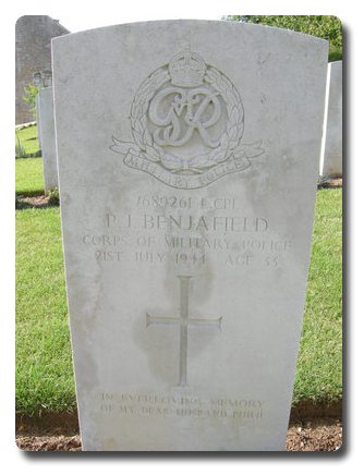 | Notes: | CMP. 53 (Welch) Division Pro Coy. He was born and resided in Surrey and enlisted in CMP. Unit War Diary WO 171/569 21/7/44 7 L/Cpl's (Benjafield, Hazzard, Penson, Harris, Hawkins, Greenstreet & Church, killed in action at PW cage. PW cage was bombed by enemy aircraft. Casualty List 1514/14, North West Europe, Killed in Action, 21/7/1944. 9/9/49 He was awarded the 1939-1945 Star, France & Germany Star, Defence Medal, War Medal. Address:- 5 Gladstone Road, Ashstead, Surrey. Inscription on gravestone: In ever lowing memory of my dear husband Philip. Philip John Benjafield. |