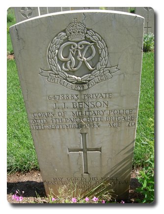 | Notes: | CMP. 4 Parachute Brigade. Airborne. Enlisted in the Royal Fusiliers. 7/6/41 Transferred to CMP. 11/9/43 Killed in Action. He was born in London East and Resided in London North West. From the diary of Cpl Don Watson, CMP, Airborne. 11/9/43 Pte Benson killed at Logo Rotunda, 7 others killed. Casualty List 1273/4, Italy, Killed in Action, 11/9/1943 Medal card not found. Inscription on gravestone: May God in his mercy make us worth to join you darling son, Pop and Bibby. James Joseph Benson. |