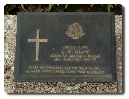 | Notes: | CMP. 18 Div Pro Coy. POW. Enlisted in the Essex Regiment, transferred to CMP. 21/6/43 Died. He was born and resided in London N. Captured at Singapore, 15/2/1942. Died of Cholera 21/6/1943 at Sonkrai, Thailand. Info from Japanese POW index card: Leonard William Blow, Born 19/10/1910 at 22 Woodside Grove, North Finchley, London N19, occupation Motor Driver, home address: Mrs K M Blow, 80 Yerbury Road, Upper Holloway, London N19, father Frederick. Listed on British POW's held in Japan or Japanese held territory: 4666, Blow, Leonard, L/Cpl, 6007163, Army, captured 15/2/1942 Died 21/6/1943, camp MA, Malaya, Deceased. Listed on Thailand POW Camp1/11/1944. Blow, Leonard, Army, L/Cpl, new POW No. IV2097, old POW No. i/1465, 6007163, 22/6/1918. Listed on Kami Sunkrai No. 1 Camp, CMP, 18 Div, died 22/6/1943. Casualty List 793/19, Malaya, Missing, 15/2/1942. Casualty List 1936/11, POW previously reported POW now reported Died, previous List 1123, Malaya, date of death 21/6/1943. Casualty List 1944/11, corrections, previous List 1936, POW previously reported POW now reported Died, Malaya. Medal card not found. Leonard William Blow. |