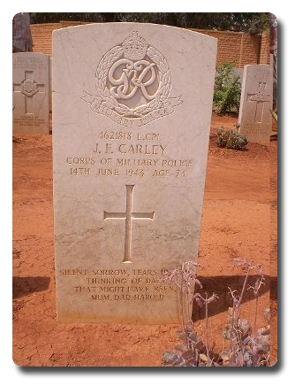 | Notes: | CMP. 13/6/40 enlisted in the Duke of Wellingtons Regiment, 25/1/41 transferred to CMP. 80 Coy TC. 14/6/43 Died. He was born and resided in Sheffield. Unit War Diary WO 169/13250 80 Company TC. 14/6/43 Lam Luda, accident occurred in convoy in which 4621818 Pte Carley J of this company, driving a 15 cwt Bedford truck, No. Z4764784 received severe head injuries from which he died on the way to hospital at Barce. Court of enquiry ordered at Matruh by DAPM Matruh Zone. Casualty List 1186/1 CMP. Libya, died as a result of an accident, 14/6/1943. 14/7/49 He was awarded the 1939-1945 Star, Africa Star,with 1 army clasp, Defence Medal, War Medal. Address:- not shown. Inscription on gravestone: Silent sorrow, tears unseen, thinking of days that might have been. Mum, Dad, Harold. James Frederick Carley. |