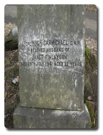 | Notes: | CMP. Enlisted in to CMP. He was born and resided in Glasgow. Casualty List 589/15, Home, died result of accident, 29/7/1941. 4/10/49 He was awarded the 1939-1945 Star, War Medal. Address:- 54 Highburgh Road, Hynland, Glasgow, W 2, Scotland. Inscription on family gravestone, badly worn and displaced. Inscription on stone below other family, Their son L/Cpl, Hugh Carmichael, CMP, beloved husband of Janet Finlayson who died 29/7/1941, age 22. Erected by Nurse McClachan. Hugh Carmichael. Information from Mr R MacGillivray, Glasgow. On February 2 1940 Hug married Janet Finlayson by declaration in Glasgow. According to the marriage certificate he was a L/Cpl in the CMP, previously a restaurant cook and resident of Glasgow. He was 20 years old and Janet was 25 years old and a restaurant waitress. Hugh was killed after a collision with a bus at Larbert Viaduct whilst riding a motorcycle. The traffic on the main Stirling to Falkirk Road went under this viaduct but there were blind spots. Not long after this accident traffic lights were erected to solve the problem. Hugh suffered multiple injuries in the accident and died at 4am on 29/7/1941 at the Base Hospital, Larbert, then Stirling & district Mental Hospital, now Bellsdyke Hospital. Hugh's usual residence was given as 172 Baldwin Avenue, Glasgow. On his death certificate he is described as a Chef. |