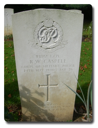 | Notes: | CMP. Enlisted in the Royal Artillery, transferred to CMP. He was born in London N and resided in London NW. Casualty List 234/7, BEF France, Killed in Action, 24/5/1940. 12/4/58 He was awarded the 1939-1945 Star, War Medal. Address:- 40 The Byway, Darlington. Co. Durham. Inscription on gravestone:- Tears are swiftly passing, but memories never fade, Mum, Nora and Peter. Reginald William Caspell. |