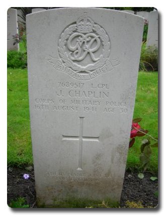 | Notes: | CMP. He enlisted in to CMP. He was born in Newcastle upon Tyne and resided in Surrey. Unit War Diary 111 Pro Coy, WO 166/5910: 16 August 41 L/Cpl Chaplin died at Memorial Hospital Darlington after a road accident. 16/8/41 L/Cpl Chaplin buried at West Cemetery, Darlington. Casualty List 600/13, Home, died as a result of an accident, 16/8/1941, rank U/L/Cpl. Casualty List 610/11, Home, List 600, died as a result of an accident, rank should read L/Cpl, CL 610/11. Medal card not found. Inscription on gravestone: There name liveth for evermore. John Chaplin |