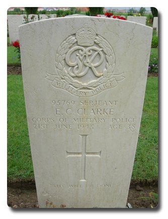 | Notes: | CMP. Formerly served in the Royal Army Service Corps, transferred to CMP. 21/6/45 Died. he was born in Northamptonshire and resided in London W. War Diary, 43 Company, TC, WO 170/7082. 21/6/45 Fatal Jeep accident at S.Dona di Piave, Sgt Clarke killed, L/Cpl Godfrey seriously injured, L/Cpl Jones slight injuries. 27/6/45 Cpl Godfrey died as a result of TA on 21st. 4/4/45 Court on enquiry at 55 Army Areas to investigate deaths of Sgt E C Clarke and L/Cpl Godfrey. Casualty List 1802, Italy, Died result of accident, 21/6/1945. 209/49 He was awarded the 1939-1945 Star, Italy Star, Defence Medal, War Medal. Address:- Mrs D M Bartlett, "Whitfield", Brackley, Northamptonshire. Inscription on gravestone: Thy will be done. Edward Clarence Clarke. |