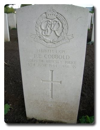 | Notes: | CMP. He was born and resided in Sussex, formerly General Service Corps transferred to CMP. 242 (Beach Pro Coy. 242 (Beach) Pro Coy, War Diary WO 171/3387. 6/6/44 D Day, Coy less 9 residues landed. Casualties, OC evacuated to UK. Lt Fairburn assumes command, 1 NCO killed (L/Cpl Cobbold) 2 NCO's evacuated to UK. Casualty List 1478/14 North West Europe, Killed in action, 6/6/1944. 12/4/58 He was awarded the 1939-1945 Star, France & Germany Star, War Medal. Address:- 3 Normandy Road, Worthing, Sussex. Inscription on gravestone: He paid the price because he loved us so, greater love hath no man than this. Unit part of 7 Beach Group, 3 Canadian Division, Juno Beach. Casualty List 1473, North West Europe, Killed in Action, 6/6/1944. Percy Leonard Cobbold. |