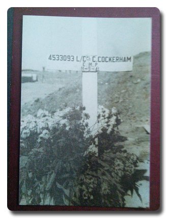 | Notes: | CMP. Enlisted in the West Yorkshire Regiment. 13/5/40 transferred to CMP. 12/9/41 Died. He was born and resided in Leeds. Named Cockerhan in CWGC Roll. 203 Pro Coy Unit War Diary WO 169/2558: 12/9/41 4533093 L/Cpl Cockerham killed in traffic accident during air raid. Casualty List 624/8, Egypt, died result of accident, 12/9/1941. 7/9/49 He was awarded the 1939-1945 Star, Africa Star with 8 army clasp, War Medal. Address:- Not shown. Clifford Cockerham. Extract from Yorkshire Evening Post, 18/9/41. YORKSHIRE CASUALTIES. A Leeds man killed in a traffic accident in the Middle East is Lance Corporal Clifford Cockerham (28) of the Corps of Military Police, husband of Mrs Irene Cockerham, 11 Bertie Street. Before joining the Army in May last year he was a cutter at Burtons Ltd and was on the committee of the firm's swimming club. He left two children. |