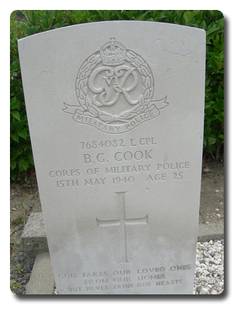 | Notes: | CMP. He was born in Buckingham and resided in Hereford. Casualty List 211/3, BEF, France, accidentally killed, 15/5/1940, 1 Div Pro Coy, 16. 28/2/50 He was awarded the 1939-1945 Star, War Medal. Address:- 30 Lime Street, Evesham, Worcestershire. Inscription on gravestone: God takes our loved ones from our homes but never from our hearts. Benjamin Godfrey Cook. |