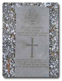 | Notes: | CMP. 22/5/39 Enlisted in the Hampshire Regiment, transferred to Royal Warwickshire Regiment, 25/1/41 transferred to CMP. He was born in Southampton and resided in Warwickshire and formerly served in the Royal Warwickshire Regiment. Casualty List 831/6, Home, Died, 16/4/1942. Inscription on gravestone: CWGC stone on a family plot. Not now but in coming years it may be in the better land, the meaning of our tears we'll read and understand. Date of death on family stone is given as 15/4/42. Name spelt Crabbe on family stone. Address shown as 54 Thistle Street. Medal card not found. Sidney Reginald Crabbe. |