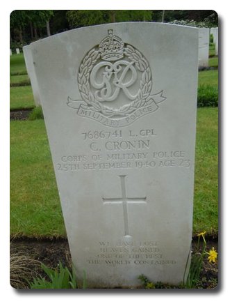| Notes: | CMP. Enlisted in to CMP. He was born in Derby and resided in London SE. Casualty List 331/33, Home, Died, 25/9/1940. 28/2/50 He was awarded the 1939-1945 Star, War Medal. Address:- Mrs K Cronin, 21 Dunston House, Dunston Road, Haggerston, Dalston, London E 8. Inscription on gravestone: We have lost, heaven gained one of the best the world contained. Cornelius Cronin. |