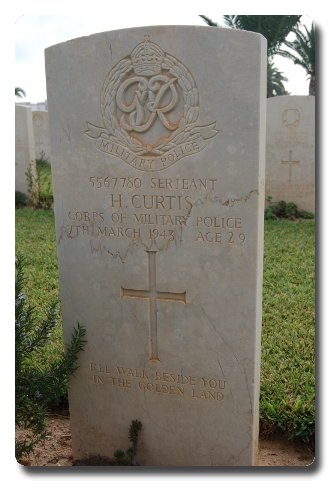 | Notes: | CMP. 51 Div Pro Coy. 3/4/1933 he enlisted in the 4 Wiltshire Regiment TA at Devizes, age 19 years, occupation motor driver, born Warminster, Wiltshire, later enlisted in the Coldstream Guards, 23/1/40 transferred to CMP. Casualty List 1098/3, Tunisia, killed in action, 7/3/43. GSM 1918 Palestine. Medal card not found. He was born in Wiltshire. Unit War Diary 51 (H) Division Pro Coy WO 169/8806. 7/3/43 Sgt Curtis killed by enemy action, aircraft strafing, L/Cpl Laing wounded in legs, L/Cpl Cox superficial wounds. Inscription on gravestone: I'll walk beside you in the Golden Land. Harold Curtis. |