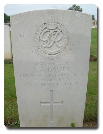| Notes: | CMP. 6 Airborne Div Pro Coy. He was born in London SW and resided in Surrey and enlisted in CMP. Unit War Diary WO 171/436. No mention of death. No inscription on gravestone. Casualty List 1491/23, North West Europe, Missing, 6/6/1944. Casualty Lists 1575/18, North West Europe, Previously reported missing now reported killed in action, 6 Airborne Div Pro Coy, previous List 1491, 7/6/1944. 26/7/48 He was awarded the 1939-1945 Star, France & Germany Star, Defence Medal, War Medal. Address:- Not shown. Sidney Alfred Davies. |