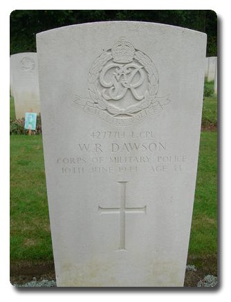 | Notes: | CMP. He was born ind resided in Northumberland and formerly served in the Royal Northumberland Fusiliers, transferred to CMP. 245 (Beach) Pro Coy. Unit War Diary WO 171/3390. 10/6/44 04.00 L/Cpl Baker wounded and evacuated to UK, L/Cpl Dawson killed by bombs. No inscription on gravestone. Casualty List 1488/15, North West Europe 1488, Killed in Action, 10/6/1944. 8/8/49 He was awarded the 1939-1945 Star, France & Germany Star, Defence Medal, War Medal. Address:- 3 Anchorage Terrace, Durham City, Co. Durham. Walter Robson Dawson. |