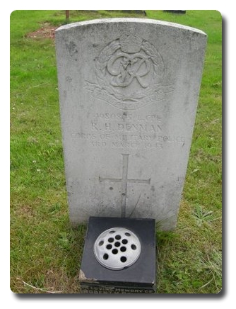 | Notes: | CMP. 13/6/40 enlisted in the Sherwood Foresters, 25/1/41 transferred to CMP. TC. 3/3/43 Died. Casualty List 1097/17, Home, Died as a result of an accident, 3/3/1943. 7/9/49 He was awarded the Defence Medal, War Medal. Address:- Mrs M Denman, 16 Smith Street, Radford, Notts. He was born in Derbyshire and resided in Nottingham. no inscription on gravestone, inscription on stone vase: In loving memory of Robert H Denman, March 3rd 1943. Robert Holmes Denman. |