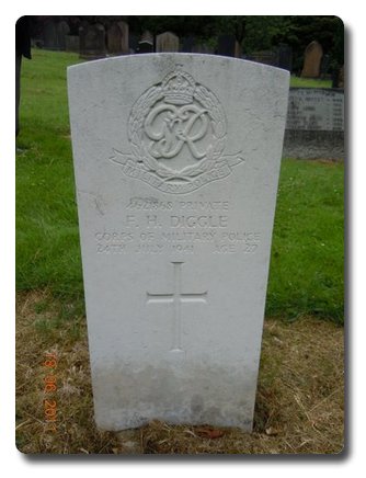 | Notes: | CMP. 13/6/40 enlisted in the Duke of Wellingtons Regiment, 25/1/41 transferred to CMP. TC. 24/7/41 Died. He was born and resided in Manchester. Casualty List 594/14, Home, Died, 25/7/1943. Casualty List 598/22, Home, Died, 25/7/1941 should read 25-25/7/41. 9/7/49 He was awarded the War Medal. Address:- 13 Gould Street, Denton, Manchester, Lancs. No inscription on gravestone. His grave is shown as A Sec. F. grave 164 in CWGC Roll but it is in Sec. E.. Frederick Herbert Diggle. |