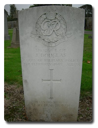 | Notes: | CMP. Formerly served in the Kings Own Scottish Border Regiment transferred to CMP. TC. Unit War Diary: 1 Company Traffic Control, CMP, WO 166/17772. 4/2/45 1 other rank died from injuries received in an accident. Casualty List 1668/11, Home, Died, 4/2/1945. Casualty List 1714/22, Correction, Home, previous List 1688, should read died result of accident, 4/2/1945, L1714/22. 7/11/48 He was awarded the Defence Medal, War Medal. Address:- not shown. Inscription on gravestone: In loving memory of a dear husband. James Douglas. |