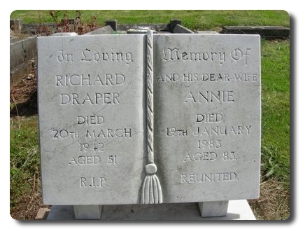 | Notes: | CMP. Enlisted in to CMP. He was born in Nottinghamshire and resided in Nottingham. Inscription on private gravestone in the form of an open book: In loving memory of Richard Draper died 20th March 1941. Age 51 and his dear wife Annie, died 19th Jan 83, aged 83. Re united. Casualty Lists 800/32, Home, Died, 20/3/1942. 20/9/49 He was awarded the War Medal. Address:- Mrs A Draper, 1 Coronation road, Hucknall, Notts. Richard Draper. |