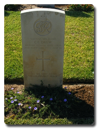 | Notes: | MPSC. 11/11/44 died. Born in Buckinghamshire and resided in Reading. Formerly Ox & Bucks Light Infantry transferred to MPSC. 21 Area Pro Coy War Diary, WO 169/15937. 11/11/44 telephone message fro SIB, a truck with 10 soldiers and 2 ATS washed away at Wadi Gaza. Casualties unknown. 14/11/44 SIB advise body washed up at Gaza Lido, believed to be that of S/Sgt McGeachi, 57 MPDB. 16/11/44 telephone message from SIB, body of S/Sgt Drew C found on Gaza Beach and taken to 91 General Hospital. Sgt Cornish is not mentioned but died on the same day as McGeachi and Drew. Inscription on gravestone: Till we meet again peace perfect peace. Casualty Lists 1612/2, Palestine, missing, date not reported, shown on CMP List. (Shown as CMP on this list). Casualty List 1625/2, Palestine, previously reported missing date not reported now reported died result of accident., 1612, date not reported. Casualty List 1747, Palestine, previously reported missing, date not reported, now reported dead as a result of accident., date not recorded. 26/7/48 He was awarded the Defence Medal, War Medal. Address:- Not shown. Charles Frederick Drew. |