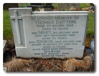 | Notes: | CMP. He enlisted in to CMP. He was born in Liverpool and resided in Manchester. Inscription on private gravestone: In loving memory of Thomas Dutton, died 8th March 1943, age 72 years and Mary his beloved wife, died 22nd November 1962, aged 82 years. Also George there beloved son killed in action 8th June 1941, aged 31years, also their daughter Marion died 18th August 1986, aged 79 years. Died 9/6/1941. Casualty List 541/9, Home, died as a result of accident, 9/6/1941. Medal card not found. George Edward Dutton. |