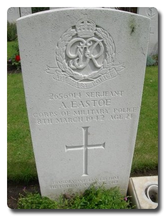 | Notes: | CMP. 44 Div Pro Coy. Enlisted in the Coldsteam Guards, 3/1/40 transferred to CMP. 8/3/41 Died. He was born in Lincolnshire and resided in Lincoln. WO 166/6275, War Diary 44 Division Provost Coy. 8/3/1942 Canterbury, One Sergeant (Eastoe) and one L/Cpl (Chadbourne) died as a result of a road accident, 7/3/1942. Both wore crash helmets, but nonetheless sustained severe head injuries. Casualty Lists 775/28, Home, died as a result of an accident, 8/3/1942. Medal card not found., Inscription on gravestone: Fondly we loved him, he is dear to us still. Albert Eastoe. |