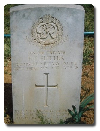 | Notes: | CMP. He was born in Surrey and resided in Middlesex. 17/11/1924 he enlisted in the Royal Artillery age 19.2 years, occupation factory hand, born Egham, Surrey, 6/11/1930 to Army Reserve, 6/4/1942 transferred to CMP. 179 Company Ports War Diary WO 175/1214. 8/3/1943 No. 1059310 Pte Flitter F died of a carcinoma. Casualty list 1077/7, North Africa, Died, 17/2/1943. 2/12/48 He was awarded the 1939-1945 Star, Africa Star with 1 army clasp, Defence Medal, War Medal. Served 18 years RA & CMP. Address:- Not shown. Inscription on gravestone: In loving memory of Frank, gone but not forgotten. Loved by all at home. Frank Thomas Flitter. |