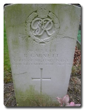 | Notes: | CMP. Formerly Cavalry of the Line (Hussars). 13/6/40 Transferred to CMP. Casualty List 707/8, Home, Died result of an accident, CMP, 546482, Garnett, L/Cpl, R, 148 Ind. Inf Bde Pro Unit. 18/12/1941. Shown as Royal Artillery amended to CMP. CL711/12 Casualty List 711/12, Home, Died as a result of an accident, 148 Ind Bde Pro Unit. Medal card not found. 18/12/41 Died. He was born and resided in Leeds. Inscription on gravestone: He will not grow old as we that are left grow old, old age shall not weary him. Robert Garnett. Extract from the Northern Whig - Wednesday 31 December 1941. MILITARY POLICEMAN'S DEATH. A verdict of accidental death was returned at the inquest in Belfast yesterday, into the death of Lance Corporal Robert Garnett (36), a member of the Royal Military Police. Garnett with two other soldiers was on motor-cycle patrol on the Belfast Doagh road on December 18 when all three riders skidded and Garnett's machine collided with an oncoming coal lorry. |