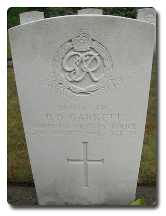 | Notes: | CMP. Enlisted in the Gloucester Regiment, transferred to CMP. Casualty List 1514/34, North West Europe, Wounded, 19/7/1944. Casualty Lists 1834, Western Europe, Died as a result of an accident, 2/8/1945. He was born and resided in Birmingham. No inscription on gravestone. Not listed in Crozier Roll or Army Roll of Honour. 9/9/49 He was awarded the 1939-1945 Star, France & Germany Star, Defence Medal, War Medal. Address:- Mrs F Garrett, 56 Trafalgar Road, Moseley, Birmingham 3, Warwickshire. Raymond Douglas Garrett. |