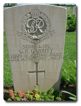 | Notes: | CMP. 105 Pro Coy. 13/6/40 enlisted in the Lancashire Fusiliers, 25/1/41 transferred to CMP. 12/10/43 Died. He was born and resided in Blackburn. Diary of Sgt F Howden, CMP: Run down by a British truck whilst route signing, L/Cpl Roberts, Seriously injured. 105 Pro Coy War Diary, WO 169/13253. 12/10/43, 09.30 hrs accident occurred on road north of Cerignola involving Company 15 cwt truck and a 3 ton lorry resulting in the death of L/Cpl Garrity, and severe injuries to L/Cpl Roberts, both of this coy. 15.00 hrs L/Cpl Garrity buried in civil cemetery at Cerignola. Casualty List 1279/6, North Africa, Accidentally Killed, 12/10/1943. Medal card not found. No Inscription on gravestone. Charles Francis Garrity. |