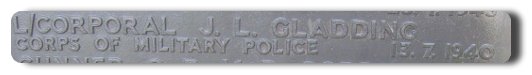 | Notes: | CMP. He was born in London NW and resided in London N. 108 Pro Coy War Diary WO166/5907 12/7/1940 Sgt Rowe reported and accident to Gladding at Maidstone whilst riding a motorcycle on a road recce. 13/7/1940 OC to Maidstone to make arrangements for enquiry into death of L/Cpl Gladding killed as a result of a motor cycle accident 12/7/1940. Casualty List 273/55, Home, died as a result of a accident, 76, 13/7/1940. Medal card not found. James Leonard Gladding. Extract from Sevenoaks Chronicle and Kentish Advertiser, 19/7/40. Military Policeman Killed at Wrotham. Lance Corporal J L Gladding, of the Corps of Military Police, was fatally injured on Friday when his motorcycle collided with a keep left pylon on the Maidstone - Sevenoaks road at Wrotham. Lance Corporal Gladding was the fourth in line of a section of motorcyclists which turned into the road from the main road, and the only explanation for the accident which was advanced at the inquest at Maidstone on Monday was given by Sgt J Rowe, the section leader, who said "the only thing I can possibly think of is that something went wrong with the machine." The Coroner Mr C P Whitehead, returning a verdict of "Accidental Death," said that although it was obvious that a third party could be responsible, the evidence threw no light on shy he failed to avoid the pylon. |