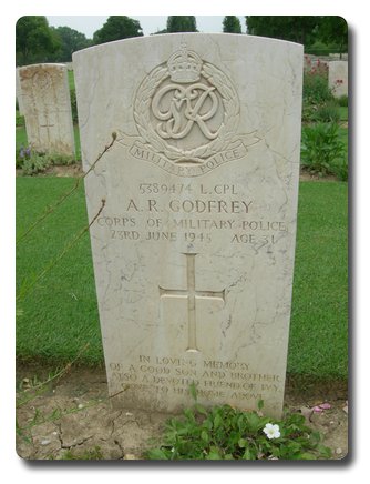 | Notes: | CMP. He was born and resided in Reading and formerly served in the Ox & Bucks Light Infantry. War Diary 43 Company Traffic Control, WO 170/7082. 21/5/1945, fatal jeep accident, S Dona Di Piave, Sgt Clarke killed, L/Cpl Godfrey seriously injured, L/Cpl Jones slight injuries. 27/6/1945, Cpl Godfrey died as a result of traffic accident on 21st. 4/4/1945 court on enquiry at 55 Army Area to investigate deaths of Sgt E C Clarke and L/Cpl Godfrey. Casualty List 1802/4, Italy, died as a result of accident, 23/6/1945. 7/9/49 He was awarded the 1939-1945 Star, Italy Star, Defence Medal, War Medal. Address:- Mrs E Godfrey, "Greenlands", Rectory Road, Streatley, Reading, Berks. Inscription on gravestone: In loving memory of a good son and brother, also a devoted friend of Ivy, gone to his home above. Arthur Ronald Godfrey. |