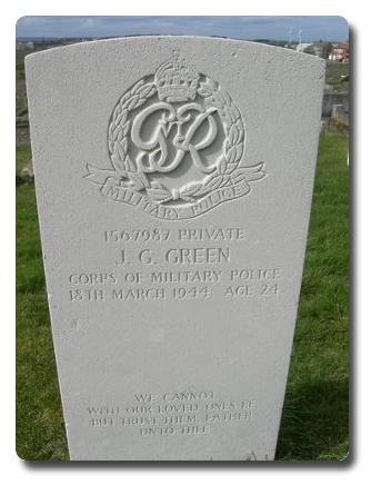 | Notes: | CMP. He was born in County Durham and resided in Arbroath and formerly served in the Royal Artillery. Casualty List 1411/16, Home, Died Result of Accident, accidentally killed L1416/18, 18/3/1944. Casualty List 1416,/18 Home, Died Result of Accident, should read Accidentally Killed, 18/3/1944. 12/4/50 He was awarded the Defence Medal, War Medal. Address:- Mrs O Green, 73 Dans Castle, Tow Law, Bishop Aukland, Co. Durham. Inscription on gravestone: We cannot with our loved ones be, but trust them Father unto thee. John George Green. |