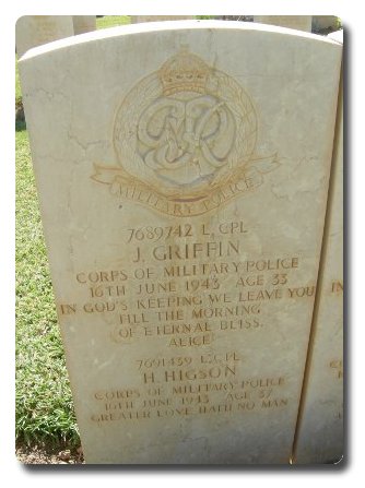 | Notes: | CMP. He was born and resided in Leeds, enlisted in to CMP. War Diary 1 Div Pro Coy WO 175/134. 16/6/1943, Pantelleria, operation Corkscrew, bombing raid NCO's killed, L/Cpl's Vanner, Griffin, Higson, L/cpl Woods wounded and L/Cpl Hoyle severe injuries to eyes. Casualty List 1179/3, North Africa, Killed in Action, 16/6/1943. 20/9/48 He was awarded the 1939-1945 Star, Africa Star with 1 army clasp, Italy Star, War Medal. Address:- Not shown. Inscription on gravestone: In God's keeping we leave you till the morning and eternal bliss. John Griffin. |