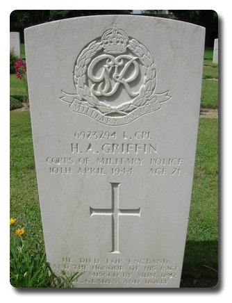 | Notes: | CMP. Enlisted in the Rifle Brigade, transferred to CMP. He was born and resided in London N. War Diary 813 Special Pro Coy, WO 170/3569. Died as a result of a battle accident on his way to hospital. Taken to 3 Canadian General Hospital, Avellino, transferred to 92 British General Hospital, Naples, where he died. L/Cpl Griffin buried at 92 General hospital in grave No. 018. Funeral attended by OC and 6 L/Cpl's from this unit. Casualty List 1428/15, Italy, Died Result of Accident, date not reported. 26/7/48 He was awarded the 1939-1945 Star, Africa Star, Italy Star, War Medal. Address:- Not shown. Inscription on gravestone. He died for England and the honour of his race, sadly missed by Mum, Dad, Bill, Gladys and Dolly. Hubert Alfred Griffin. |