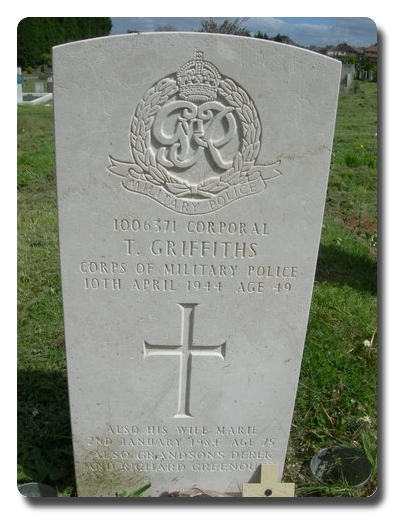 | Notes: | CMP. Enlisted in the Royal Artillery (Field, Coast & AA). 27/6/40 Transferred to CMP. 3/4/86 born. 10/4/44 Died. He was born in Liverpool and resided in Bradford. He also served in World War I. Casualty List 1423/16, Home, Died as a result of accident, 10/4/44. 7/9/49 He was awarded the Defence Medal, War Medal. Address:- 100 Rosse Street, Brownroyd, Bradford, Yorks. Inscription on gravestone: Also his wife Marie, 2 Jan 1984, age 75 years, also Grandson's Derek and Richard Greenough. Thomas Griffiths. |
