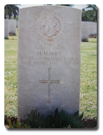 | Notes: | CMP. He was born and resided in Leeds. War Diary WO 169/8748, 7 Armd Div Pro Coy. Tunisia, 30/3/1943, 6 teams and 6 motorcycles on divisional axis, 1 truck blown up on mine, 4 NCO's wounded, L/Cpl Haley later dies from wounds, 3 remaining NCO's evacuated. Casualty List 1115/3, Tunisia, Died of Wounds, 30/3/1942. 28/10/48 He was awarded the 1939-1945 Star, Africa Star, War Medal. Address:- Not shown. Inscription on gravestone: "Treasured memories of Harry, a dear husband and daddy loved by all." Harry Haley. |