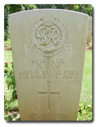 | Notes: | CMP. Enlisted in the Royal Fusiliers. 14/12/40 Transferred to CMP. 1 Div Pro Coy. 15/3/44 Killed in Action. He was born in London SW and resided in Middlesex. 15/3/44 killed by shellfire with Cpl Holleley of same unit. War Diary 5 Div Pro Coy, WO 170/435 8/3/44 Embarked for Anzio (only mention in diary). Casualty List 1404/7, Italy, Killed in Action, 15/3/44. 5/9/49 He was awarded the 1939-1945 Star, Africa Star, Italy Star, War Medal. Address:- 14 Clunbury Avenue, Southall, Middlesex. Inscription on gravestone. Deep in our hearts his memory is kept, one whom we love and shall never forget. Alfred Ham. Extract from the Middlesex Chronicle 1/4/1944. L/CPL A HAM KILLED. News has been received by Mrs Florence Rose ham of 14, Clunbury Avenue, Heston, that her husband Lance Corporal Alfred Ham has been killed by enemy action in Italy in March. A native of Fulham, Alfred Ham was the son of Mr and Mrs Ham of Sutton Way, Heston and resided in Heston for 14 years. Prior to enlistment soon after the outbreak of war he was employed at the Heston Milk Depot of the London Cooperative Society. He saw service in India, Africa, Iraq and Sicily before being transferred to the Italian Front. Thirty four years of age, he leaves a son age five. (article has a picture of L/Cpl Ham in SD cap and battle dress. |