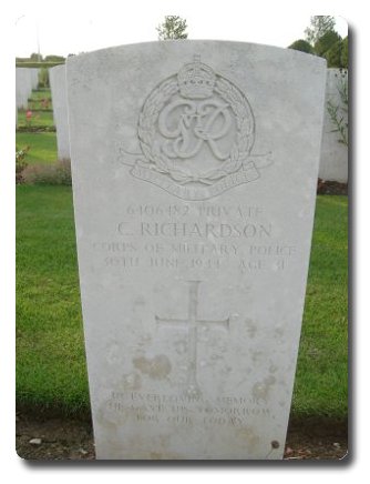 Notes: | CMP. He was born and resided in Essex and formerly served in the Royal Sussex Regiment transferred to CMP. 604 Coy VP. Shown as CQMS in soldiers died. War Diary, 604 Company VP, WO 171/3385. 28/6/44 First casualty 6406482 Pte C Richardson admitted to hospital at Reviers as a result of a motorcycle accident. Died 30/6/44. Casualty List 1549, North West Europe, Wounded, 28/6/1944, 28/6/1944, delete above entry (subsequently shown on List 1501 as died of wounds), 28/6/1944. Casualty Lists 1497/27 North West Europe, Wounded,28/6/1944, deleted CR1549/32. Casualty List 1501/13, North West Europe, reported wounded now reported Died of Wounds, previous List 1497, 30/6/1944. Casualty List 1552/35, North West Europe, previous wounded not died of wounds, 28/6/1944, 30/6/1944, should read Died of accident previous list 1501, 1497 corrected by 1549. 28/2/50 He was awarded the 1939-1945 Star, France & Germany Star, Defence Medal, War Medal. Address:- 12 Dawlish Drive, Leigh on Sea, Essex. Inscription on gravestone: In ever loving memory, he gave his tomorrow for out today. Charles Richardson. |