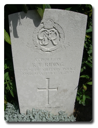 Notes: | CMP. Enlisted in the Royal Armoured Corps, transferred to CMP. 22/5/40 Died. He was born in Southport and resided in Liverpool. Casualty Lists 261/2, BEF, France, Killed in Action, 22/5/1940. Medal card not found. Inscription on gravestone:- God's greatest gift remembrance. Robert Thomas Riding. Extract from the Liverpool Evening Express, 29/6/1940. Roll of Honour. L/Cpl Robert Riding, age 28, of the Corps of Military Police was killed when struck by a bomb splinter in France on May 22. He is married to Christina. Before the war Riding served with the Army for seven years in India. Mrs Riding is living with her mother in Botanic Road, Southport. |