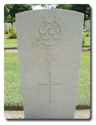 Notes: | CMP. 13/6/40 enlisted in the Northamptonshire Regiment, 25/1/41 transferred to CMP. TC. 25/3/44 Died. He was born and resided in Northampton. Inscription on gravestone: Death did to me short warning give. 25/3/1944 Casualty List 1413/17, Italy, Died as a result of an accident, 25/3/1944. Medal card not found. Charles Robins. |