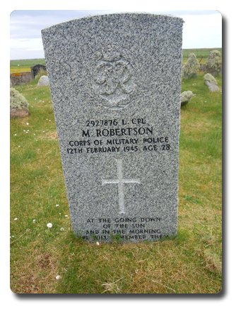 Notes: | CMP. 172 (HQ) Pro Coy Inverness. He was born in Invernessshire and resided in Inverness and 28/6/1937 enlisted in the Scots Guards Regular Army for 4/8 years, age 21.5 years.30/11/1942 transferred to CMP His No. in Army Roll of Honour is shown as 2927878. Casualty List 1685/16, Home, Died, 12/2/45. Inscription on gravestone: At the going down of the sun and in the morning we will remember him. Served in the Middle East, after leave he walked from Baleshare to Lochmaddy a distance of 10 miles in deep snow, he developed pneumonia and died in hospital in Inverness. (Info from chance meeting with his cousin). He is named on the local War Memorial on the Lochmaddy Road as Scots Guards. Medal card not found. Malcolm Robertson. Extract from The Oban Times, 24/3/45. Many friends and acquaintances will be grieved to learn of the sudden death in the City Hospital, Aberdeen, of Malcolm Robertson, Corps of Military Police. He was 28 years old and eldest son of Mr and Mrs Neil Robertson, Balshare, North Uist. L/Cpl Robertson joined the army in 1937 and went abroad with the 2nd Batt. Scots Guards in 1938. During his six years service in the Middle East he saw much hard fighting in the Desert and was among the few survivors from that Battalion. He was always regarded by his comrades as a gallant outstanding soldier. He was transferred from the Scots Guards to the Military Police and as a member of that Corps he served in Cairo and Alexandria before returning the this country in April 1944. His remains were taken to Balshare for burial. Representatives of the Corps of Military Police at the funeral were CSM McLeod from Inverness and L/Cpl Wooley from Aberdeen, who laid two beautiful wreaths on the grave. Other floral tributes were from his sister and friends. The death of a gallant soldier came as a great blow to the island and he will be deeply mourned by his loved ones. (article has a head and shoulders picture in Scots Guards uniform.) |