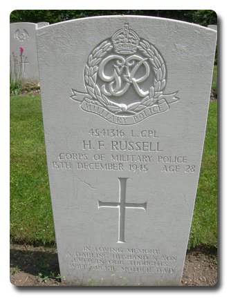 Notes: | CMP. He was born and resided in Leeds and formerly served in the West Yorkshire Regiment. 46 Div Pro Coy War Diary WO 170/4366. 15/2/1945 Graz, fatal traffic accident, L/Cpl Russel, CMP killed, 1 Regimental policeman and 3 other soldiers injured. Casualty List 1946, Austria, Died Result of Accident, 15/12/1945. Inscription on gravestone: In loving memory, a darling husband and son, ever in our thoughts, wife Nicky, Mum & Dad. Herbert Frederick Russell. |