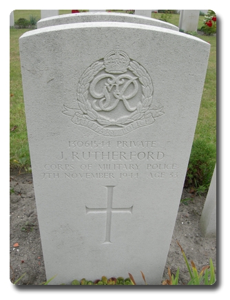 Notes: | CMP. Enlisted in the Pioneer Corps, transferred to CMP. 7/11/44 Died. He was born and resided in Glasgow. He was drowned off Oostend when LST 420 hit a German mine. Over 300 RN, Army and RAF personnel drowned including 12 CMP. Casualty List 1609/24, Western Europe, Missing, 7/11/1944. Casualty List 1705/26, At Sea, previously reported missing 7/11/1944, Western Europe, 7/11/1944, now reported killed, previous List 1609. 5/10/49 He was awarded the 1939-1945 Star, Defence Medal, War Medal. Address:- 3 Blackfriars Street, Glasgow C 1, Scotland. No inscription on gravestone. John Rutherford. |