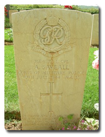 Notes: | CMP. Enlisted in to CMP. He was born and resided in Essex. Inscription on gravestone: In proud and loving memory of a dear husband and father. His loving wife Daisy, children June, Brian, Terry. Casualty List 1514/7, Italy, Missing, 9/7/44. Casualty List 1630/5 Italy, previously reported missing 9/7/44 now reported died of wounds, previous list 1514, 10/7/44. Medal card not found. Abraham Saveall. |