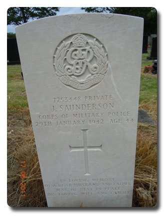 Notes: | CMP. VP. Enlisted in the Royal Army Medical Corps, later Pioneer Corps, transferred to CMP. 29/1/42 Died. He was born in Eire and resided in Wigan. Inscription on gravestone: In living memory of a dear husband and father, may he rest in peace. His loving wife and family. His CWGC stone has a George V Cap badge instead of George VI. Born 21/1/1898. 21/1/1942 Died, Home. Casualty List 738/8, Home, Died, 29/1/42. Medal card not found, Joseph Saunderson. |