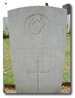 | Notes: | MFP. Awarded the Victory and War Medals. First served abroad (1) France, 6/3/1918 to 23/3/1918. He was born in Epsom, enlisted in Stratford and resided in Ilford. Killed in Action. Killed by bombs dropped by enemy aircraft with Sgt S Dallas. No Inscription on gravestone. A/Sgt with pay wef 29/1/1917, Eastern Command. Info from Army Record: 13/10/1915 enlisted at Stratford, age 29 years, occupation Joiners Mate, born Epsom, Surrey, joined 2 GV Essex Regiment No. 93390, 26/8/1916 transferred to Suffolk Regiment No. 30668, 29/1/1917 transferred to MFP, 23/3/1918 KIA serving with PM 3 Army. He had previously served in the 19 London Regiment TA, time expired. 18/9/1909 he married Mary Ann Smith, Spinster at the Registry Office, Islington, London, address 121 St Mary's Road, Ilford. 7/7/1916 he was appointed A/Assistant Provost Sergeant of Harwich Garrison. 22/6/1918 his widow received the following property: 1 9ct Gold Ring, note book (black), case, letters, charm with chain, french book, small note book, leather belt (damaged) 3 Discs. He was killed with No. P/1975 Sgt Dallas MFP. Info from Pension Index Cards:- Batchelor, Reginald Walter, P/6497, MFP. A/Sgt. 23/3/1918 killed by enemy aircraft bombs. Widow Mary Ann, born 27/6/188, 121 St Mary's Road, Ilford Essex. They had four children Dorothy May, born 1/11/1920, Walter Edmund born 14/2/1912, Winifred Annie born 23/12/1914, and Reginald Douglas Haig born 28/7/1917. 15/4/1918 his widow received a grant of £5. 7/10/1918 she received 36/13 per week pension. Also:- 43. Batchelor, Mary Ann, 121 St Mary's Road, Ilford, Essex, P/6497, A/Sgt, Reginald Walter Batchelor, MFP. Info from Army Register of Soldiers' Effects, 1901-1929. 23/3/1919 died France. 19/6/1918 his widow received £10/19-07, and 18/11/1919 a further £19 war gratuity. Reginald Walter Batchelor. |
