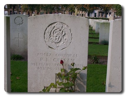 | Notes: | MFP. Awarded the 1915 Star, Victory and War Medals. First served abroad (1) France, 26/7/1915. He was born in Sevenoaks, enlisted in London and resided in Kensall Rise. Killed in Action. No inscription on gravestone. War Diary WO 95/409 4 Dismounted Traffic Control Unit, MFP. 5/11/17 No. P/1287 Sgt W Steadman and No P/1587 Cpl R L Cassam MFP and No. 4969 Pte H Gurney Army Cyclist Corps killed in Ypres by enemy shell. No. 8006 Pte P V Williams wounded in Ypres and evacuated. 6/11/17 Attended funeral of Sgt Steadman and Cpl Cassam at Prison Cemetery Ypres at 2.30pm. Info from Army Register of Soldiers Effects 1901-1929. 13/2/1918 he left his widow Kate £5/03/01, 11/11/1919 she received £11/10/00 war gratuity. Info from pension index cards:- Cassam, Robert Louis, P/1587, MFP, A/Cpl, 5/11/1917 KIA, widow Kate, born 18/2/1886 of 4 Compton Road, Kensall Rise, London, NW10 and 1 child Harold Leslie born 5/5/1907. 1/12/1917 she received a grant of £5. 20/5/1918 a pension of 26/3d per week, Later address of widow 31 Cobden Road, Sevenoaks, Kent. Robert Louis Cassam. |