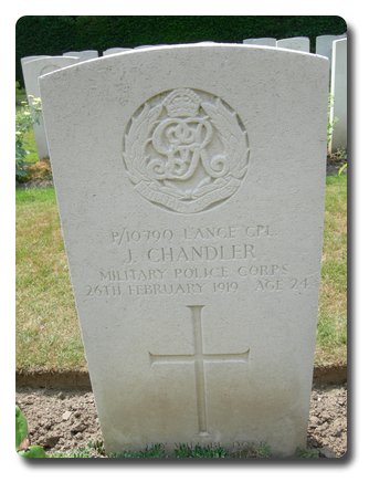| Notes: | MFP. He was born, enlisted and resided in Luton. Awarded the 1915 Star, Victory and War Medals. First served abroad (5a) East Africa ? 30/11/1915 to 12/2/1916 and (1) France, 3/1/1917 to 1/8/1917 and 4/2/1918. Died of Pneumonia. Formerly Pte. 3/1 Easter Brigade, Royal Army Medical Corps. No. 2070 & No. 90021. 24/11/1917 married Elizabeth Sarah Baxter at Sunnyside Parish Church, Berkhampstead, wife's address: 1919 Montgomerie, Doctor Common Road, Berkhampstead. 6/5/1917 to MFP, 29/7/1917 gassed evacuated to England. Served Home 10/9/1915 to 29/11/1915, Mediterranean Exp Force 30/11/1915 to 18/2/1916, Home 19/2/1916 to 2/1/1917, BEF 3/1/1917 to 2/8/1917, Home 3/8/1917 to 3/2/1918, BEF 4/2/1918 to 26/2/1919 Died. Address: absent voters list 1918, 7 Russel Street, Luton, Bedfordshire. Wife signed a receipt for the following property: photographs, 2 razors, 1 gold ring 9ct, 1 Penknife, wallet, 1 watch (no glass), steel chain, cigarette lighter, purse, 1 coin, 1 piece of medal ribbon. Info from Pension Index Card:- 134. Chandler, J, 140 George Street, Berkhampstead, Herts, 78 Larden Road, Uxbridge Road, Acton Vale, London W 3. P/10790 L/Cpl, J Chandler, MFP. Also:- 134. Chandler, Mrs E J, Berkhampstead, Herts, 3 Thompson Row, Holiday Street, J, Changler, MFP, L/Cpl, P/10790. James Chandler. Extract from the Luton & Bedfordshire Chronicle, 13/3/1919. Died On the Rhine. The death from pneumonia, is reported of PC James Chandler, of the Luton Borough Police Force, who was serving with the Military Foot Police in the Army of Occupation on the Rhine. The deceased was recently married was a native of World, Bucks, and 25 years of age. He joined the force in September 1914 and was at Luton on leave six weeks ago. |
